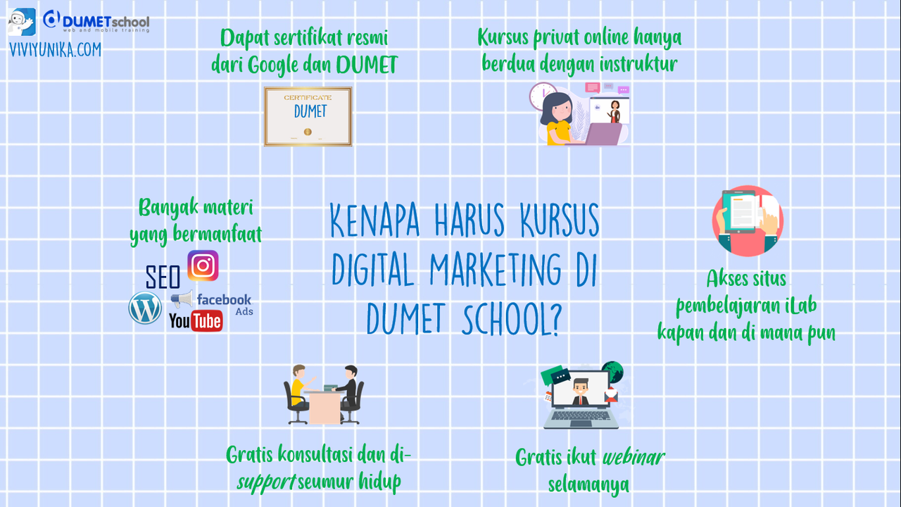 Jika sobat ingin mengambil kelas digital marketing, bisa lirik akademi yang satu ini, nih. Ialah DUMET School, akademi yang menawarkan berbagai jenis kursus baik offline maupun online. Kebetulan, karena mobilitas sedang terbatas, Dumet gencar menggelar kelas online. Khusus untuk digital marketing, kita bisa mengikuti kelas Kursus Private Live 1 On 1, loh! Menurut saya, kursus online itu sangat memudahkan, terutama bagi kita-kita yang berada jauh dari jangkauan kursus offline.