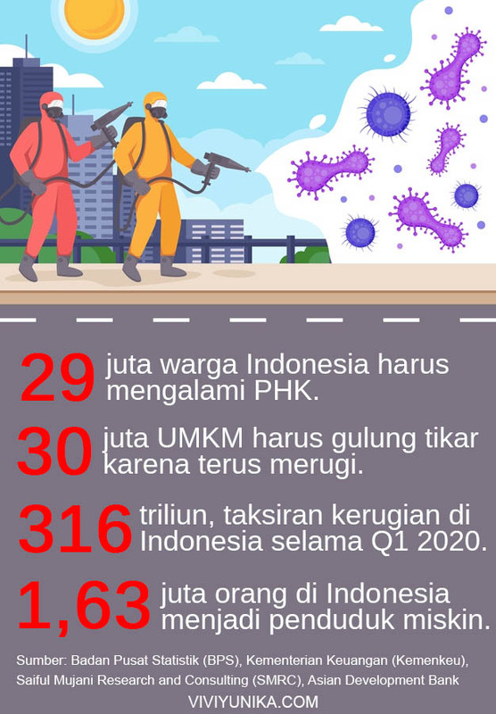 Akibat pandemi, ekonomi tak lagi bersemi. Sebut saja mulai dari sektor pariwisata, perbankan, tekstil, dan masih banyak lagi, semua ikut goyah. Berdasarkan data survei Saiful Mujani Research and Consulting (SMRC), virus COVID-19 membuat 29 juta warga Indonesia harus mengalami pemutusan hubungan kerja (PHK). Belum lagi, laporan survei Asian Development Bank (ADP) juga melaporkan bahwa terdapat 30 juta UMKM (Usaha Mikro, Kecil, dan Menengah) di Indonesia yang harus berhenti karena terkena dampak COVID-19. Itu artinya, baik perusahaan besar maupun masyarakat kecil, keduanya sama-sama mengalami masa sulit.